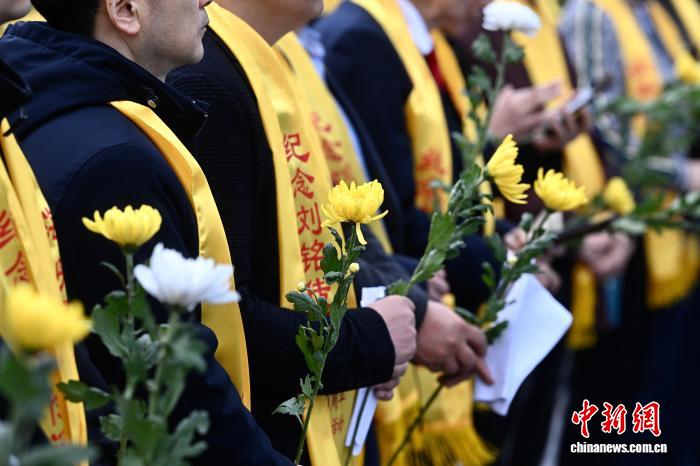 4月12日,海峡二岸(开胖)留念台湾尾任巡抚刘铭传生日190周年祭拜举动正在安徽省开胖市胖西县刘铭传墓园举办,包含刘铭传后裔正在内乱的海峡二岸各界人士二百余人参与。图为脚持陈花的公众回想刘铭传。中新社记者 韩苏本 摄